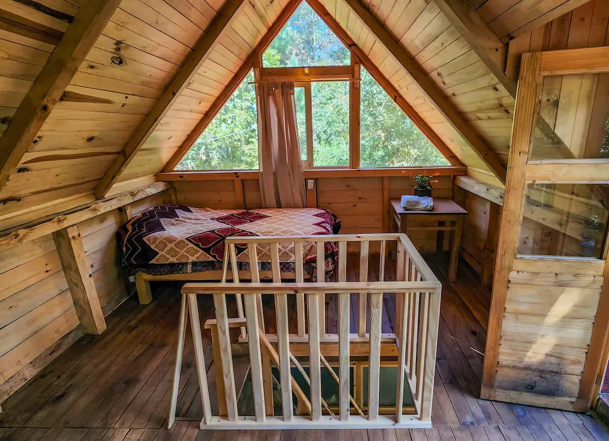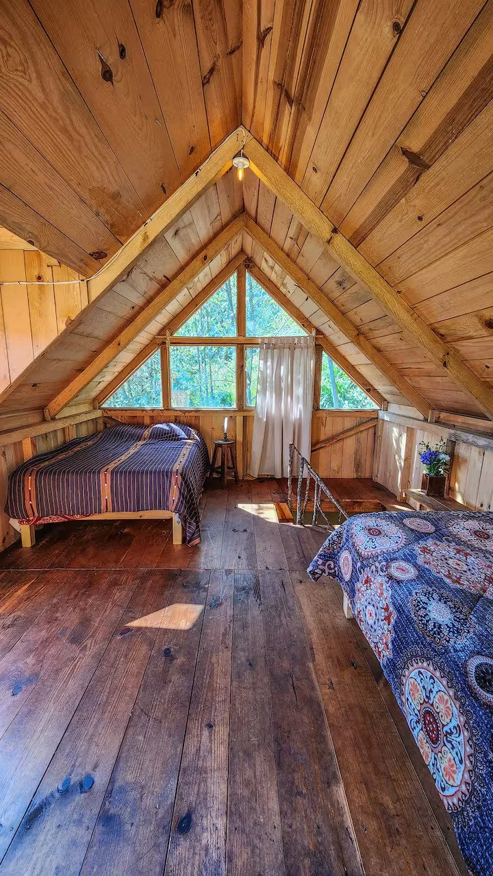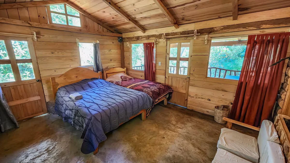Esta cabaña es ideal para familias pequeñas o amistades que desean disfrutar de unos días en la naturaleza. Con acceso a un río y una caminata entretenida entre los árboles. Esta cabaña cuenta con una habitación espaciosa con dos camas matrimoniales y una individual. En el piso principal tiene una chimenea para hacer más acogedor el espacio. El baño cuenta con agua caliente y WC. La cocina está equipada para cocinar y el agua del lavabo proviene de un manantial y se puede tomar.